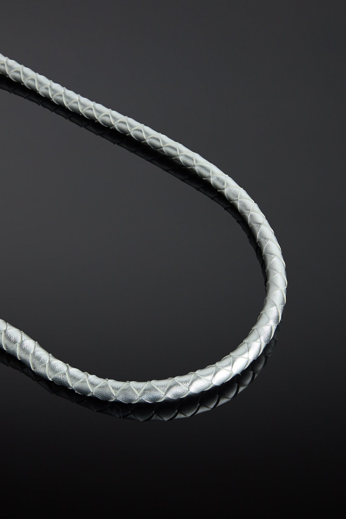 A whip of stark geometry and deliberate weight. Braided in silver leather, anchored by a polished steel handle, it balances elegance with severity. The 59-inch length carries rhythm and control, tapering into a four-inch leather tail designed for precision.
