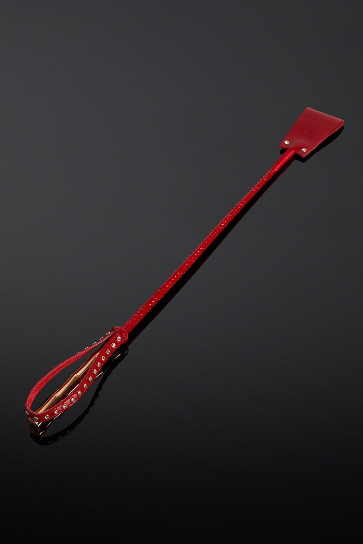 Command the room with the uncompromising silhouette of the Red Directive Crop. Cut from high-shine patent leather in a lacquered crimson, this piece is precision-braided along the shaft and finished with a gold color metal handle.