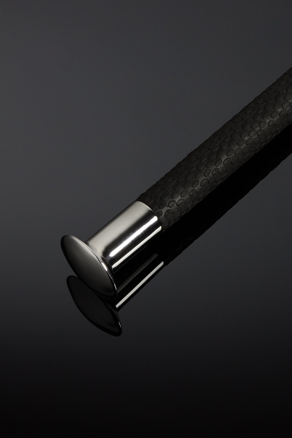 A rubberized grip anchors the hand, ensuring unwavering command even under sustained use, while polished metal detailing reinforces its sculptural presence. The shaft is wrapped in tightly braided leather, delivering both durability and a refined tactile rhythm with every motion.