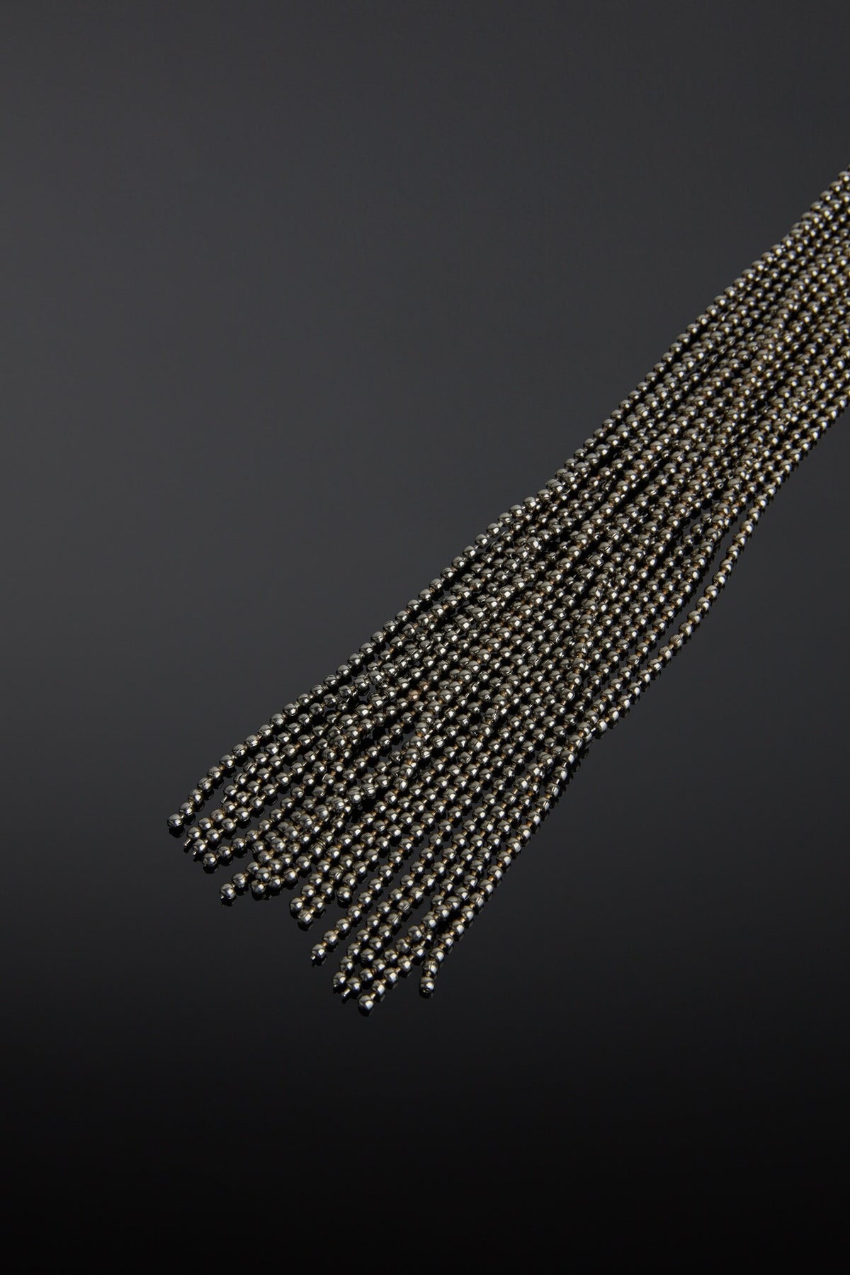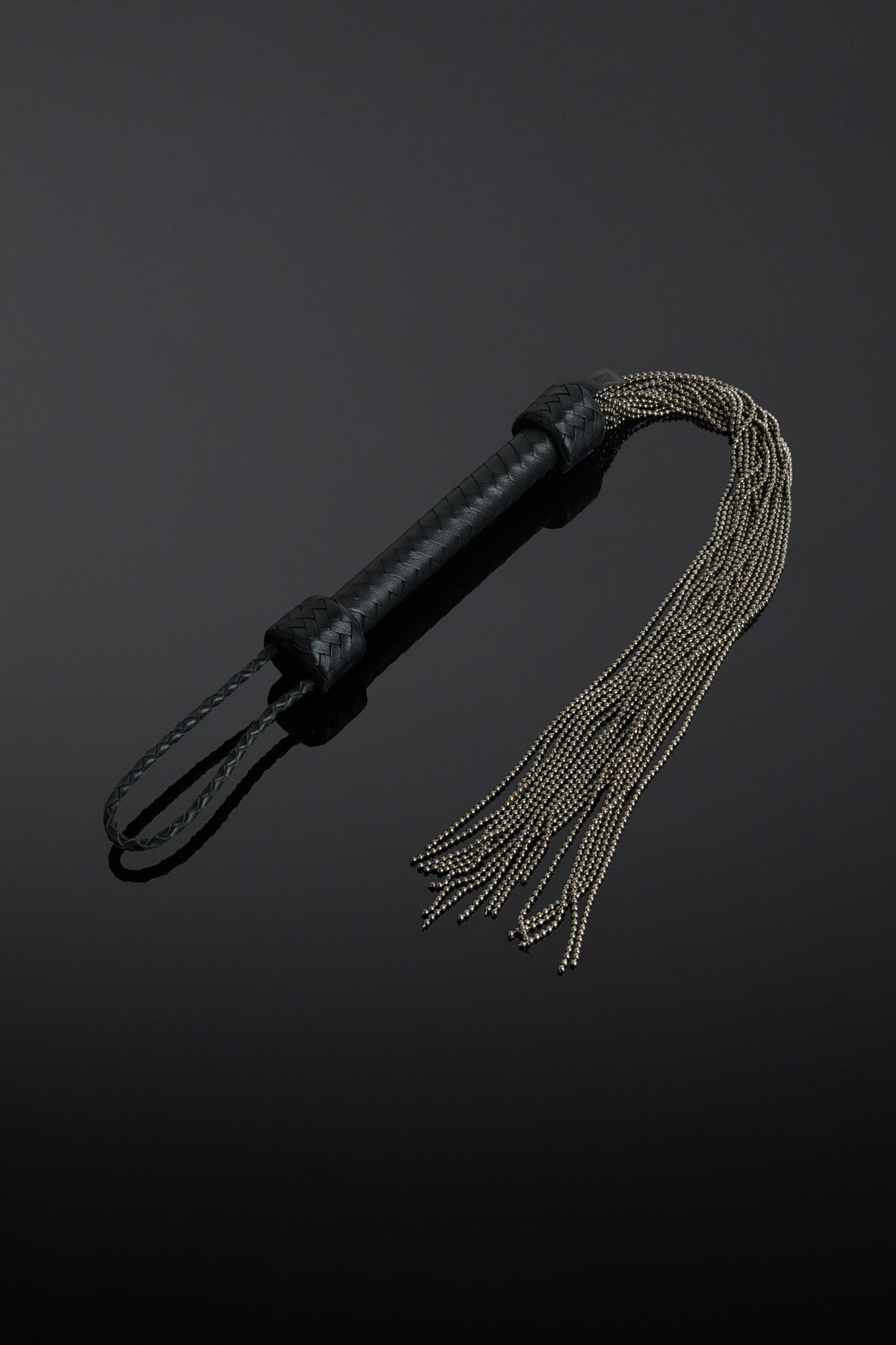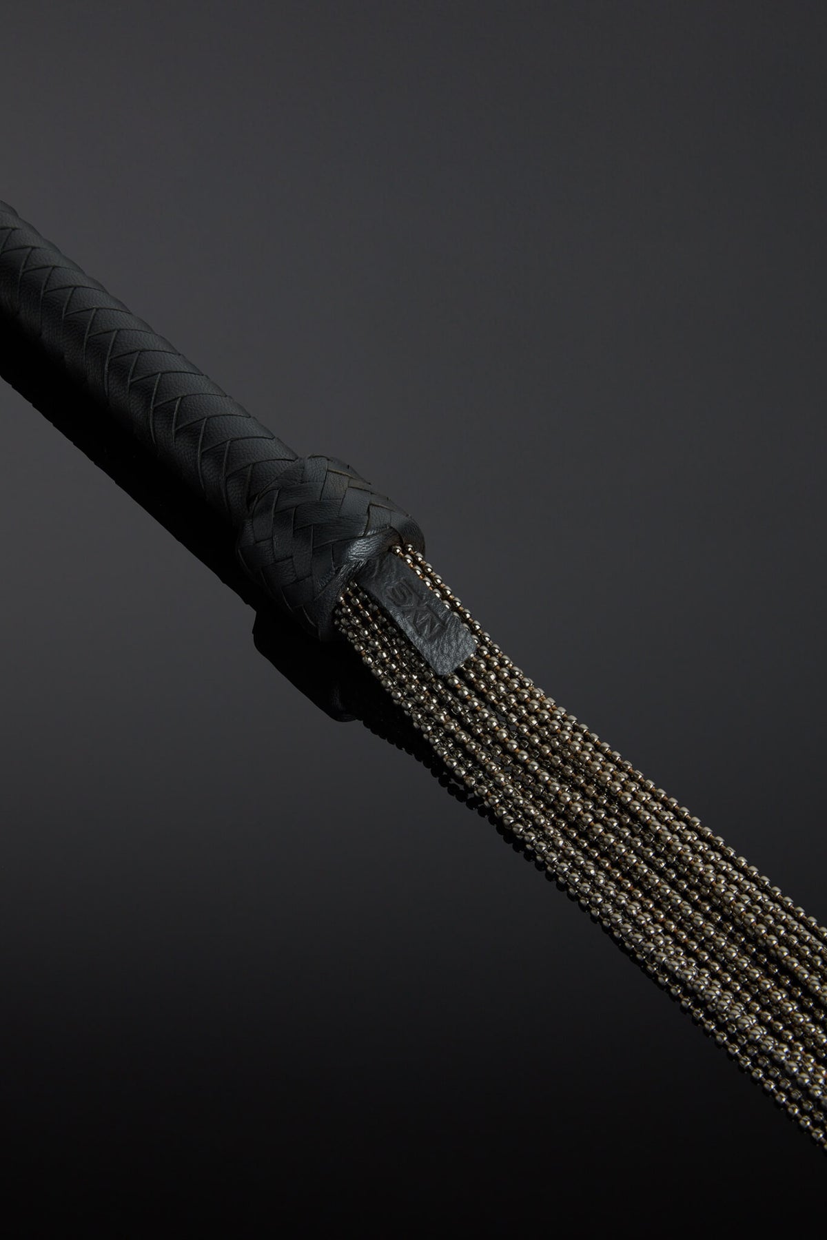 Presenting the Noir Black Ball Chain Flogger, a stunning blend of elegance and pleasureful pain from House of SXN. The handle, crafted from rich black leather, features an intricate braided design that ensures a comfortable and secure grip. The tails, composed of weighted dark-colored ball chains, are designed to deliver a distinctive and impactful sensation with each strike. The Noir Flogger is a luxurious addition to any collection, combining aesthetic beauty with the intense functionality that defines House of SXN.