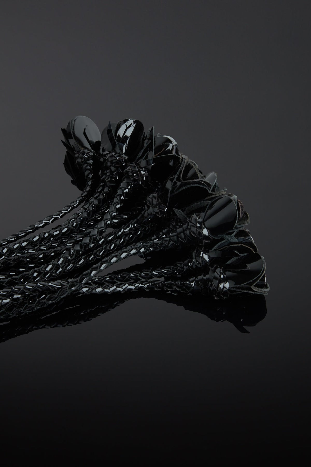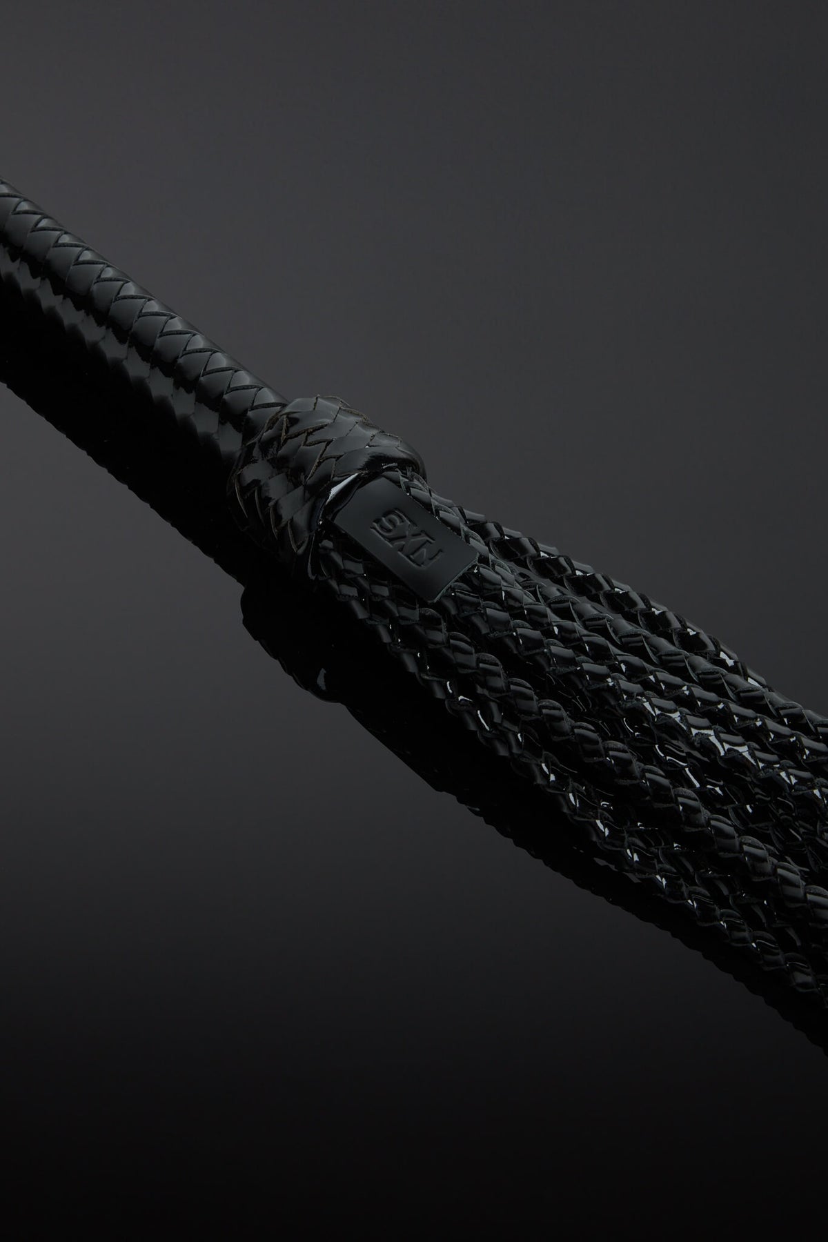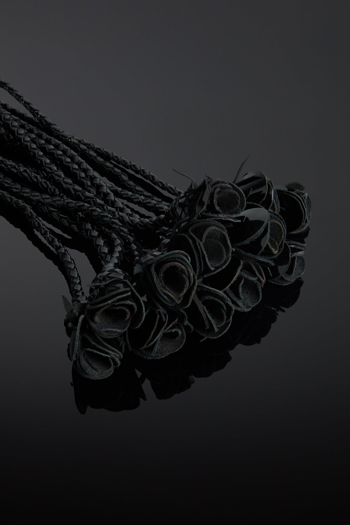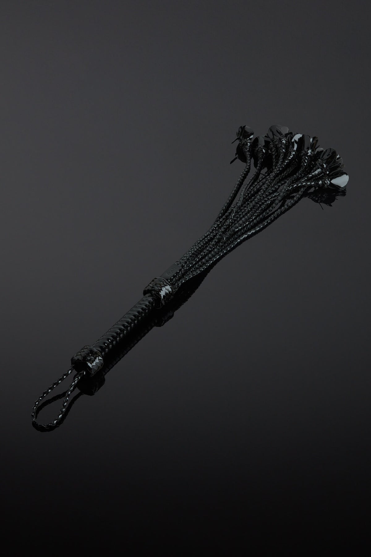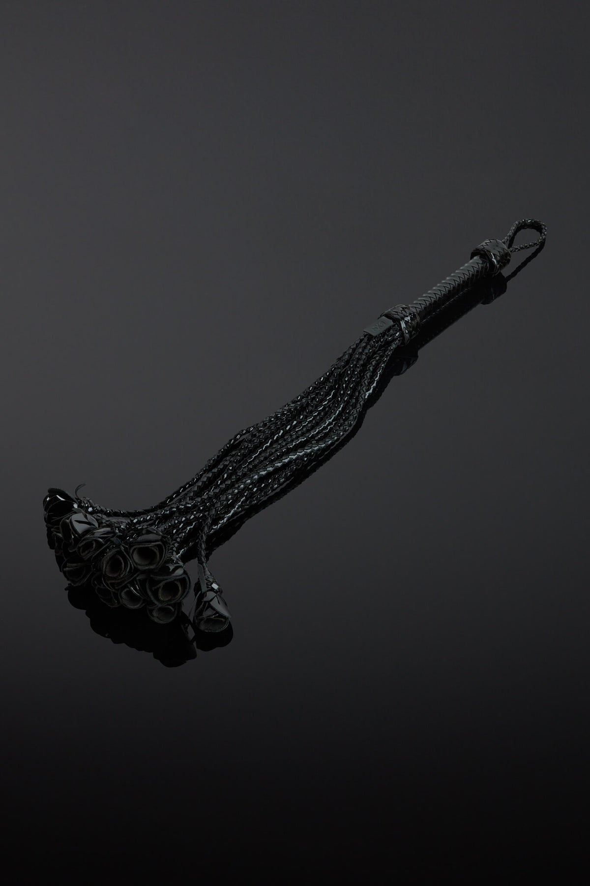 Indulge your passion for BDSM play with our Rosa Noir Patent Leather Flogger. Crafted with House of SXN's signature luxe patent leather materials. This piece features a bouquet of twelve midnight black color tails, each delicately braided and finished with a leather rose. Lose yourself in the ultimate pleasure and sophistication with House of SXN.